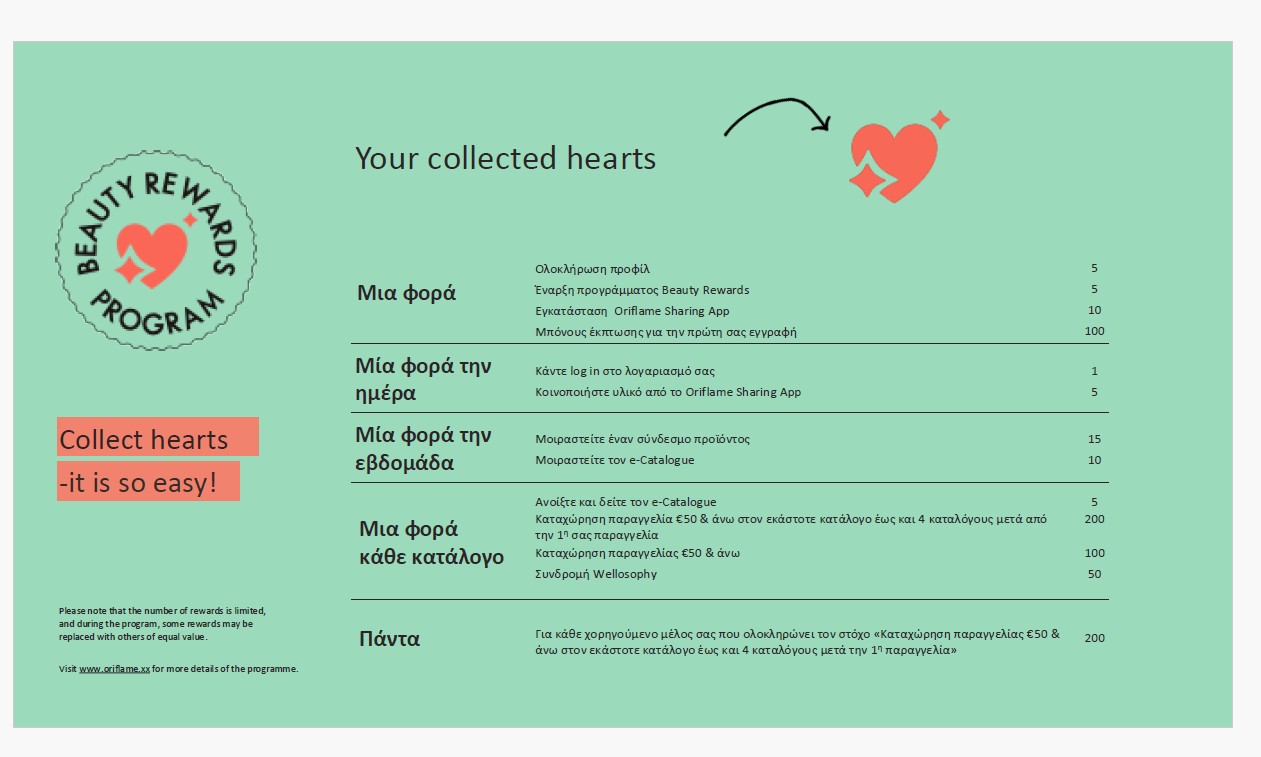 Κατεβάστε το Oriflame App από το Google Play ή το App Store για να ξεκινήσετε το ταξίδι σας στο Beauty Rewards. Μην ξεχνάτε να συλλέγετε την Καρδιά της Ημέρας, κάθε μέρα όταν επισκέπτεστε το Oriflame App.