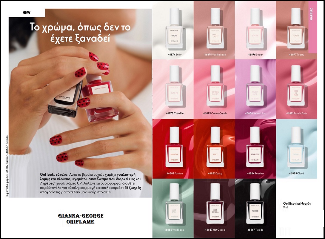 Ανακαλύψτε την αναβάθμιση στο βερνίκι νυχιών σας – αποτέλεσμα με πλούσιο όγκο, γυάλινη λάμψη και διάρκεια σε ένα προϊόν. Το Gel Βερνίκι Νυχιών της Oriflame χαρίζει αποτέλεσμα gel που διαρκεί έως και 7 ημέρες* χωρίς τη χρήση λάμπας UV. Με φαρδύ πινέλο για εύκολη εφαρμογή και 15 ζωηρές, πλούσιες σε χρωστική αποχρώσεις, είναι το εισιτήριό σας για αμέτρητα manicure looks στο σπίτι.