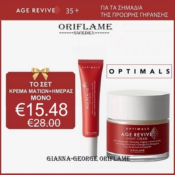 Η Optimals Age Revive είναι δημιουργημένη από τους ειδικούς στη θρέψη της επιδερμίδας για να στοχεύει πολλαπλά σημάδια γήρανσης, να μειώνει τις λεπτές γραμμές και ρυτίδες ενώ βελτιώνει τον τόνο, την υφή και τη φωτεινότητα της επιδερμίδας.