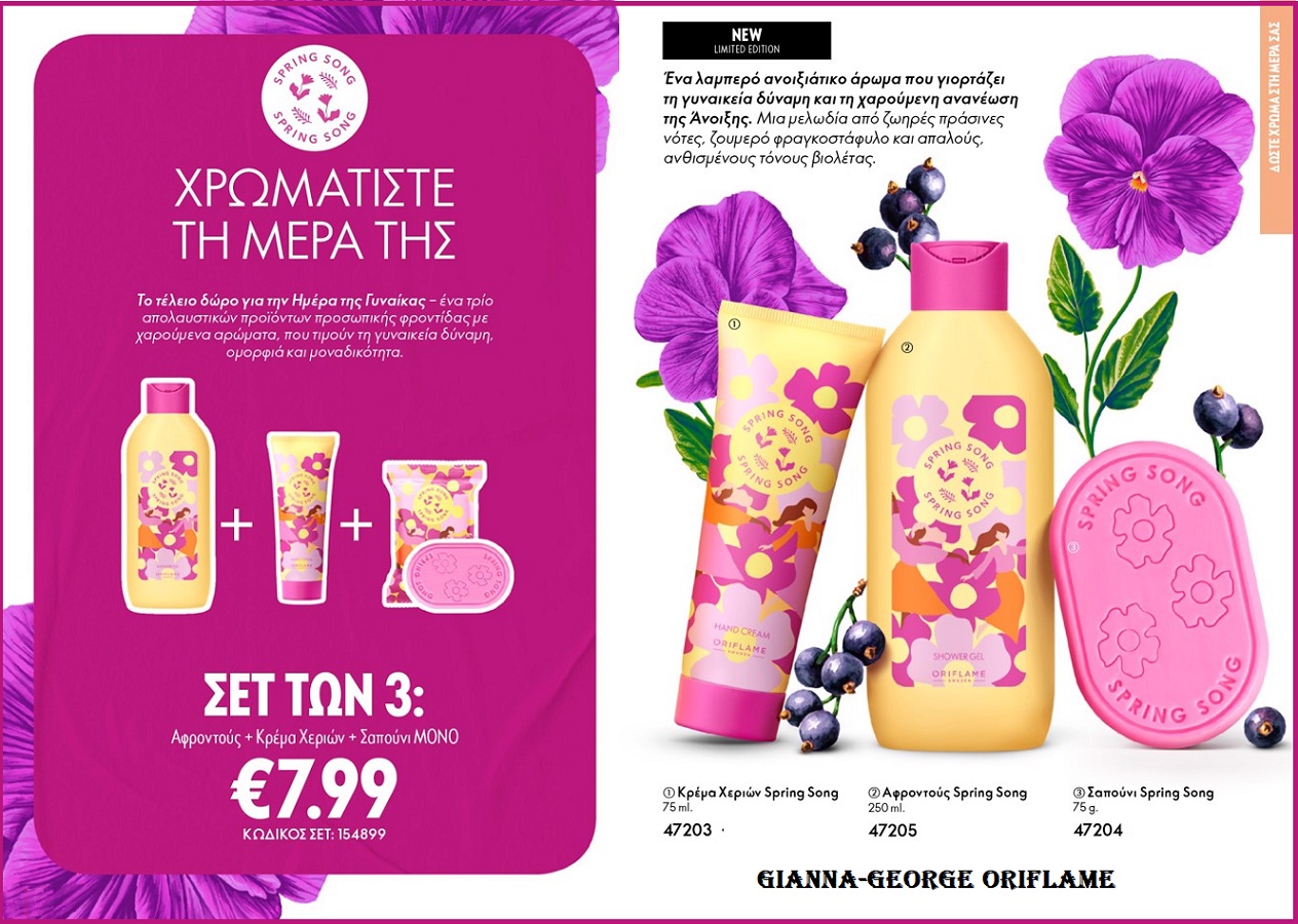 Το τέλειο δώρο για την Ημέρα της Γυναίκας. -ένα τρίο απολαυστικών προϊόντων προσωπικής φροντίδας με χαρούμενα αρώματα ,που τιμούν τη γυναικεία δύναμη ,ομορφιά και μοναδικότητα .Το Σετ περιλαμαβάνει;