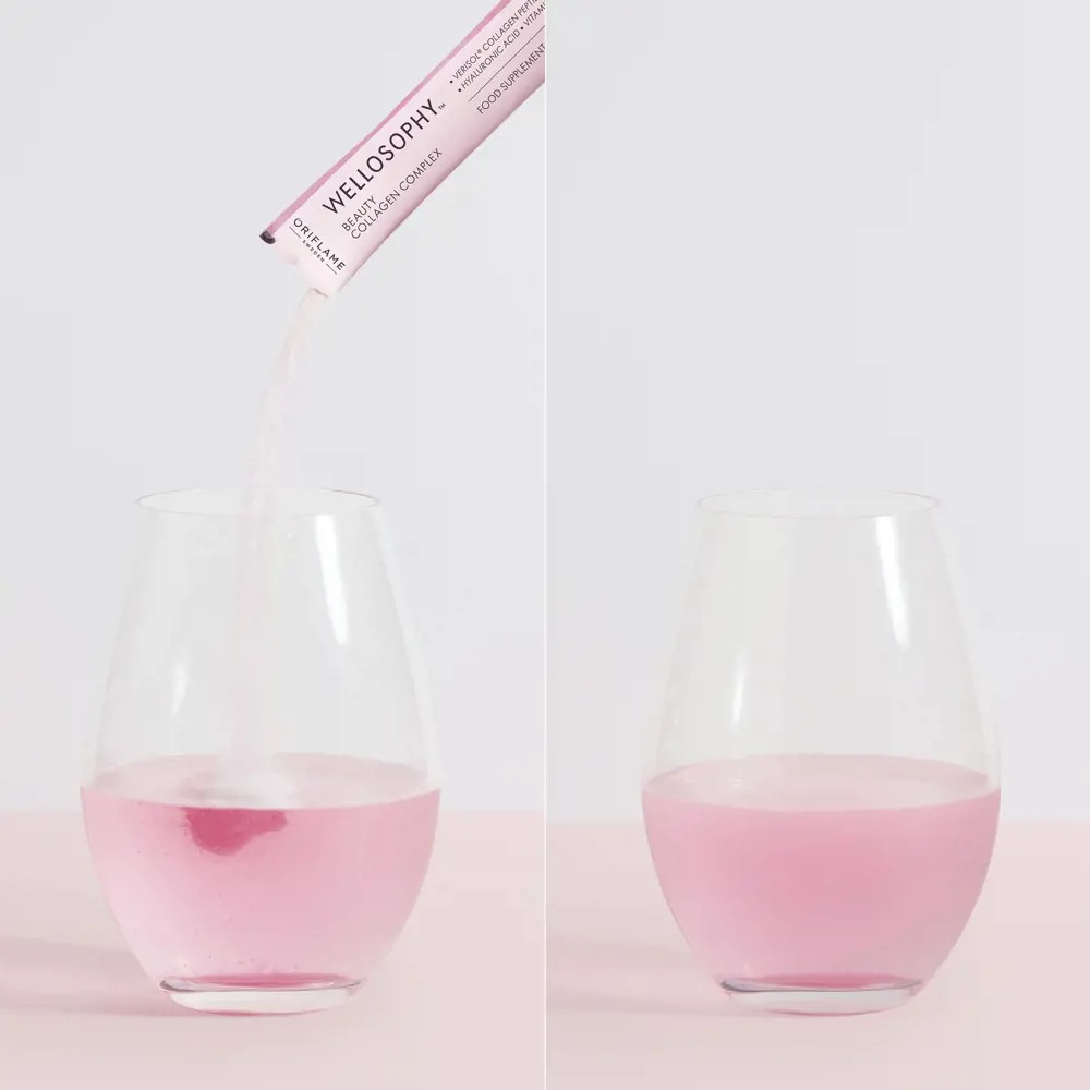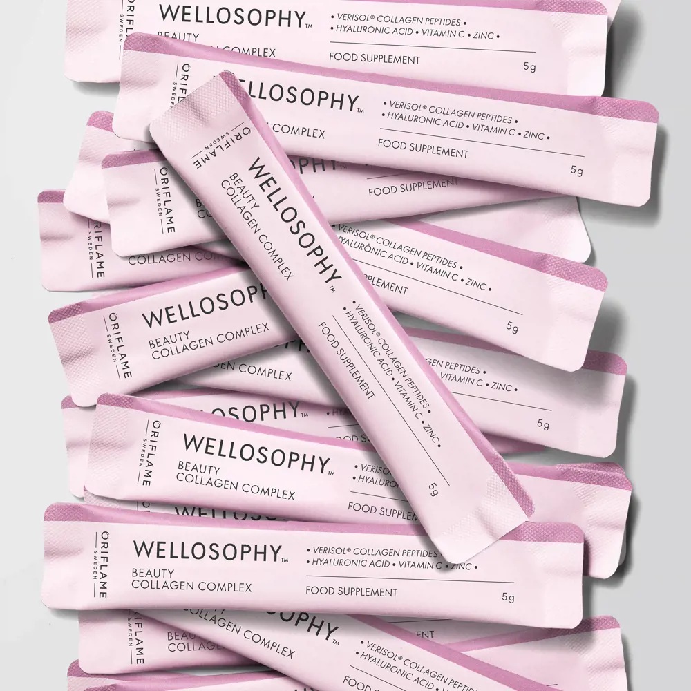 Τα φακελάκια Wellosophy Beauty Collagen Complex ταιριάζουν απόλυτα στην καθημερινή σας ρουτίνα και θρέφουν την ομορφιά σας από μέσα χωρίς καμία ταλαιπωρία. Η σκόνη με γεύση σμέουρου είναι γεμάτη με ισχυρά θρεπτικά συστατικά όπως πεπτίδια κολλαγόνου VERISOL® , υαλουρονικό οξύ, βιταμίνη C και ψευδάργυρο. Τα πεπτίδια κολλαγόνου VERISOL® βοηθούν στη βελτίωση της σφριγηλότητας του δέρματος, στη μείωση των ρυτίδων και στην υποστήριξη της ενυδάτωσης του δέρματος.** Τα συστατικά συνεργάζονται για λαμπερό δέρμα, πιο δυνατά μαλλιά και πιο υγιή νύχια.*